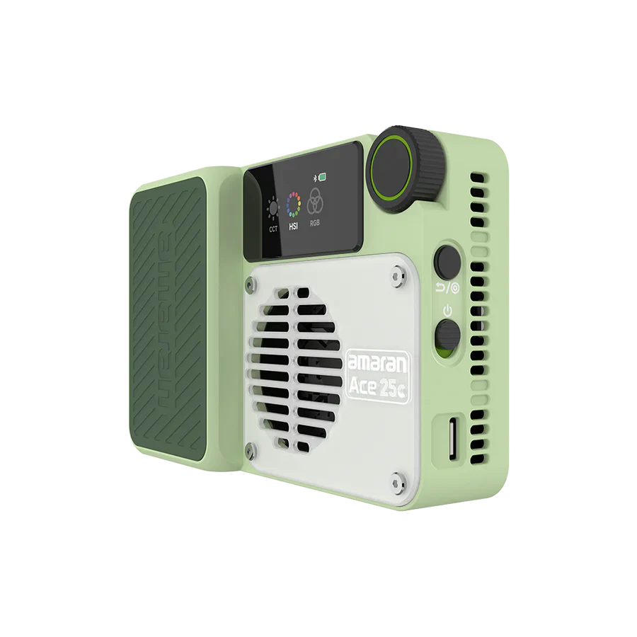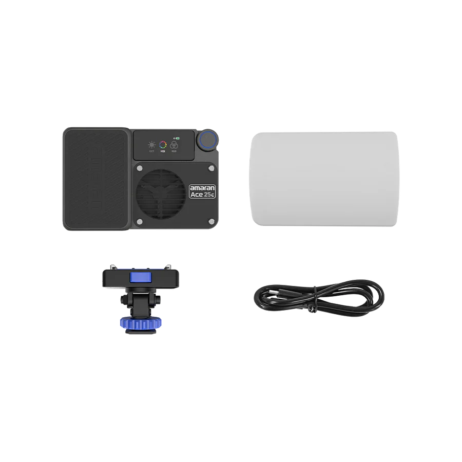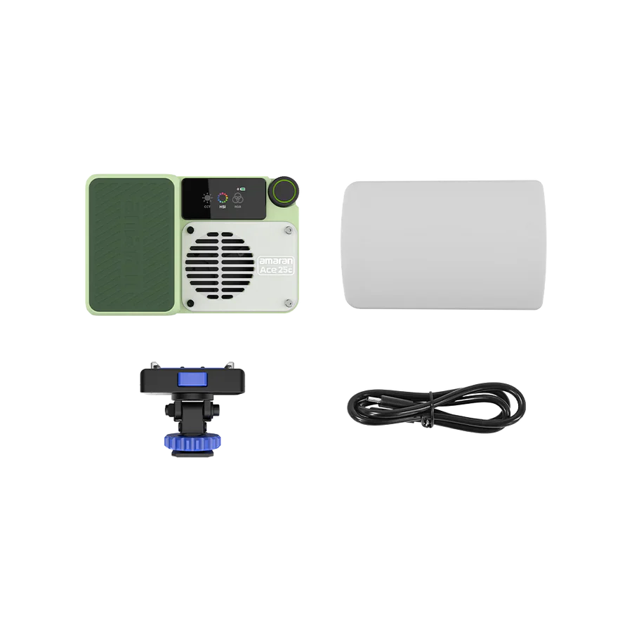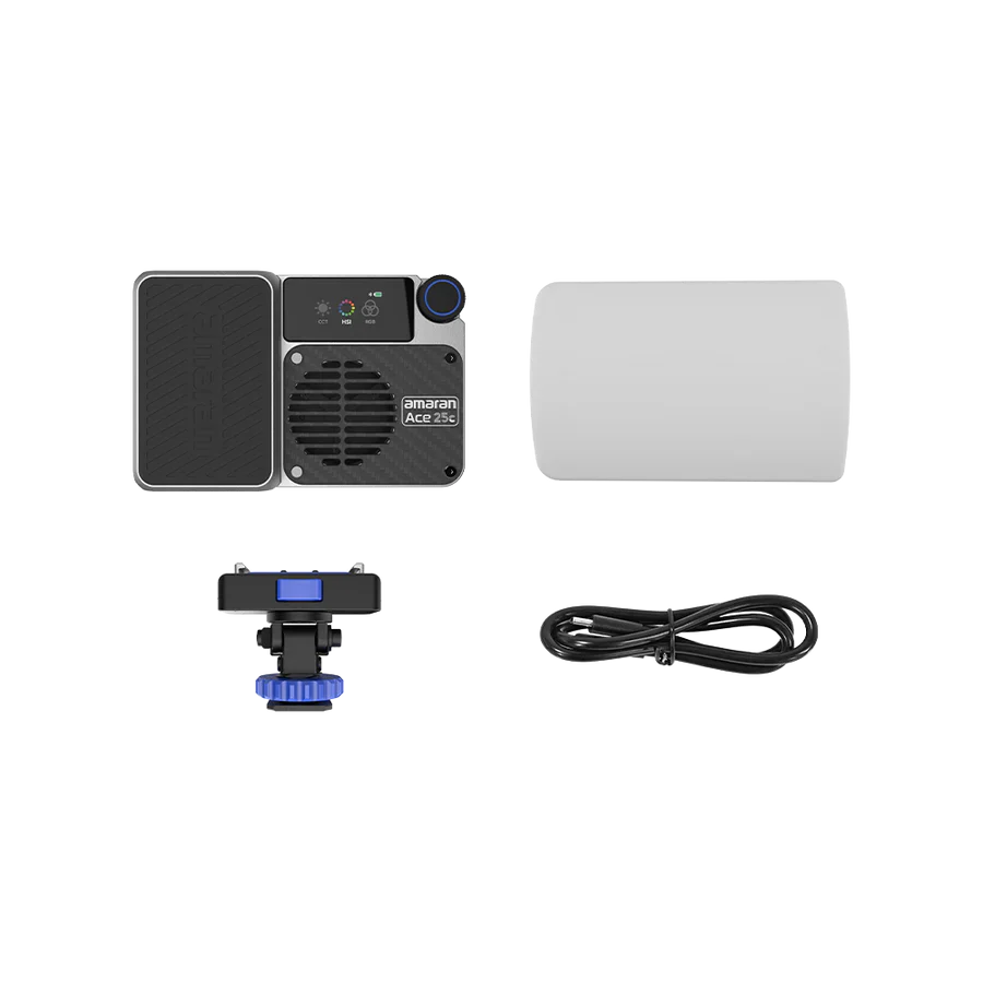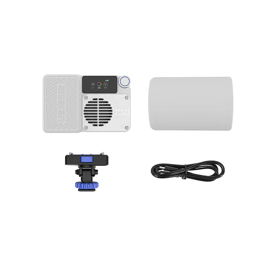 The light's internal, rechargeable battery recoups 90% of its charge in just 40 minutes with the included USB-C charging cable, achieving a full recharge in approximately 90 minutes. The included lock-to-cold shoe adapter makes the light easily mountable on any camera with a shoe mount, and a 1/4"-20 thread on the bottom of the fixture allows mounting on most light stands. The Ace 25c's magnetic front accessory mount accepts modifiers like the included dome diffuser, while a back magnetic silicone pad allows the light to be mounted on any magnetic surface.