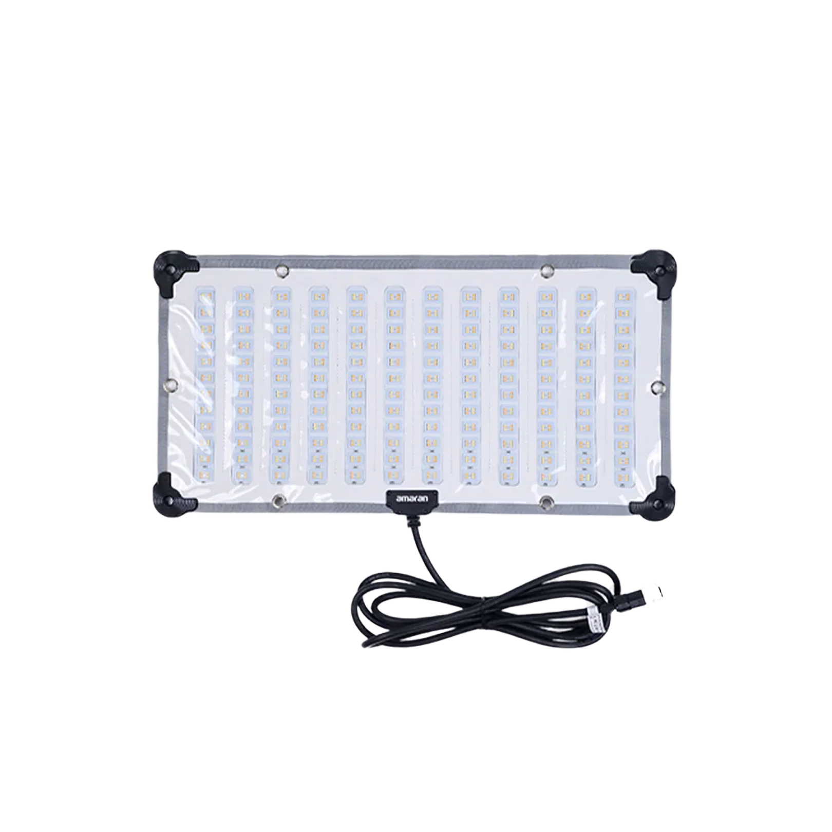 The F21x Bi-Color LED Flexible Mat from amaran is powerful, versatile, and flexible bi-color LED mat that measures 2x1'. It offers outstanding light output and color rendering suitable for a variety of users, from filmmakers to videographers, content creators, and still photographers. Providing 100W of power, this ultralight fixture's high-output bi-color chipset can be tuned from 2500K to 7500K, and features nine customizable lighting FX. It has stellar CRI and TLCI scores of 95+ and 98+, and stepless dimming from 0 to 100%. An included folding X-frame stretches the mat to a rigid panel that can be attached directly to a C-stand grip head using the straight Baby Pin adapter, or onto any standard light stand with the included right angle Baby Pin and tilting stand mount. The included foldable softbox has two strengths of diffusion, and a fabric grid that uses using an integrated hook-and-loop fabric to instantly turn this flexible mat into an ultrathin soft light that will add beautifully controlled soft light to a scene.