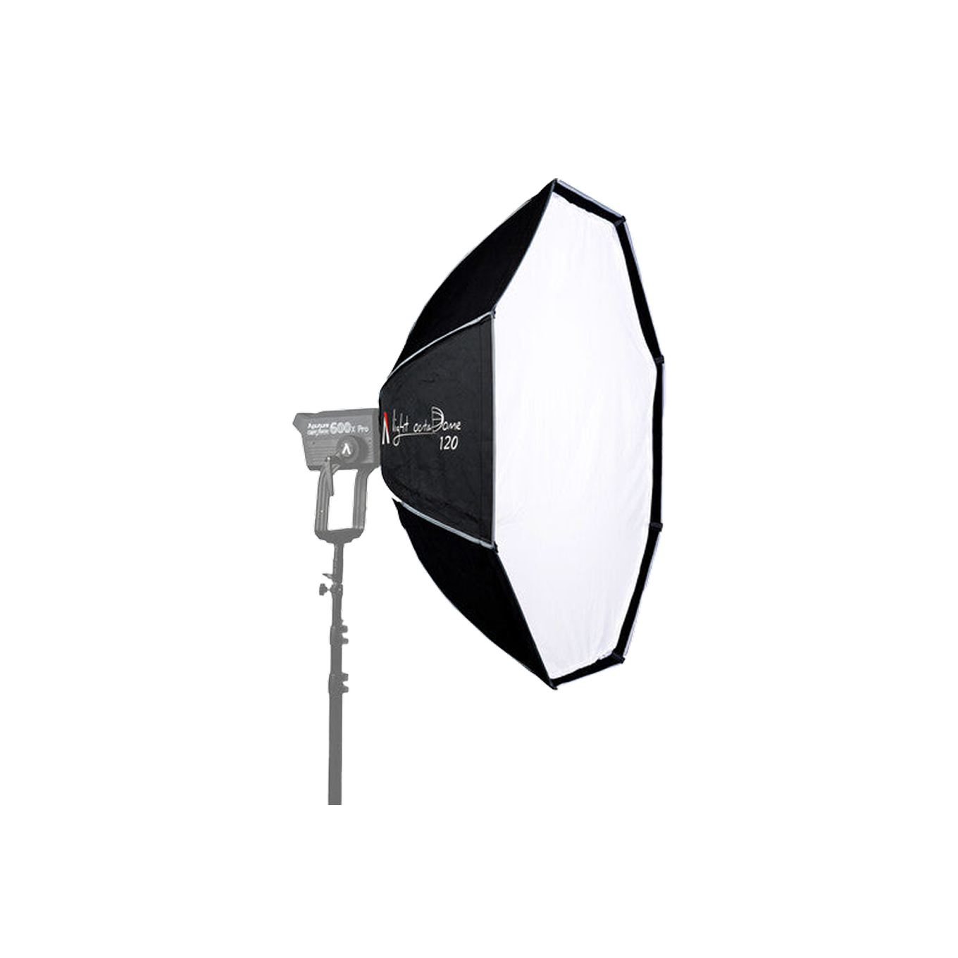The Light OctaDome 120 Bowens Mount Octagonal Softbox from Aputure has eight sides to transform any point source Bowens-mount light fixture into an ultrasoft area light, blanketing your subject or set in diffused light. It has a large 47" diameter and two front diffusers, plus an inner baffle to allow you to fine-tune intensity and light quality. The shape offers balance between a square frame or a fully circular softbox. It is lightweight at 3.75 lb and can be flat packed for on-the-go shooting.