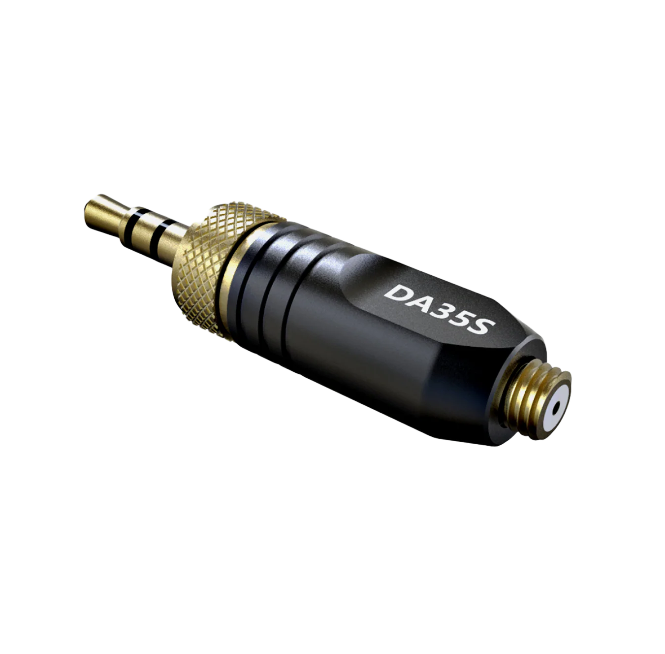 The DA35S connects the center pin of the modular microdot connector to the ring pin on the 3.5mm connector. Each connector is gold-plated to improve connectivity and prevent tarnishing. The two parallel flat sides provide the user with an ergonomic grip surface to hold onto when connecting the lav to the transmitter.