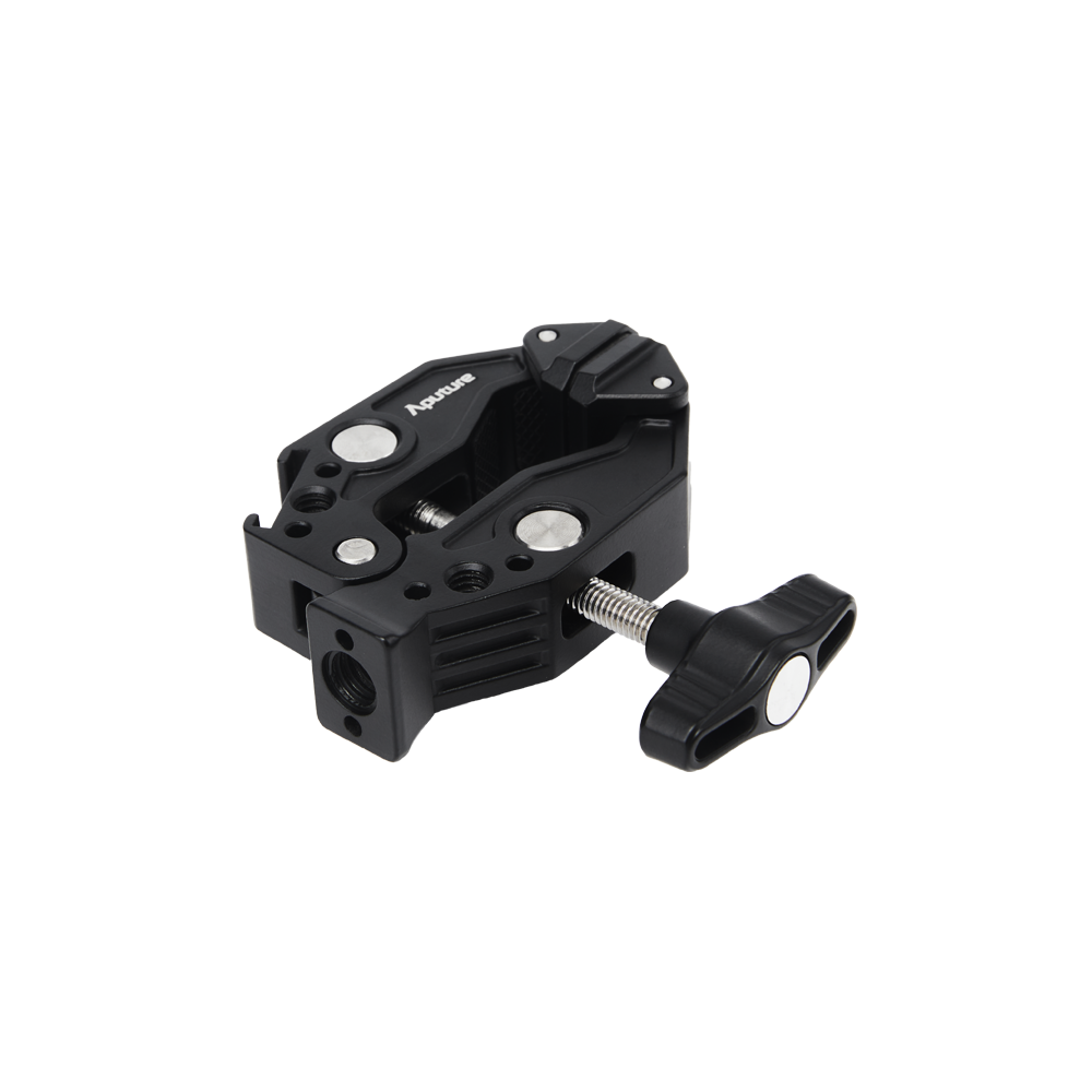 The Aputure Super Clamp with 3/8in anti-rotating pin thread is a mounting clamp compatible with 3/8in screw fixtures and accessories. Featuring a cold shoe and ¼-20in threads, this can be used to secure Aputure lights and accessories onto a variety of surfaces. Its max payload capacity is a STORM 80c with a CF4 Fresnel and CF4 Barn Doors (1.92kg / 4.23lbs).